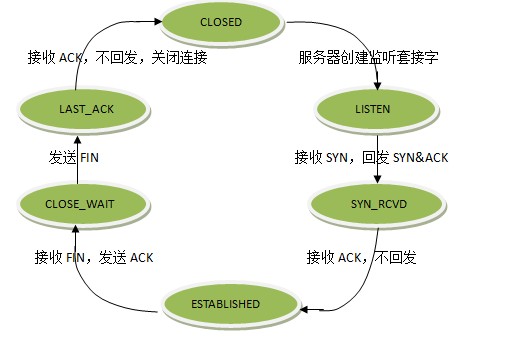 LAST_ACK: 这个状态还是比较容易好理解的,它是被动关闭一方在发送FIN报文后,最后等待对方的ACK报文。当收到ACK报文后,也即可以进入到CLOSED可用状态了。